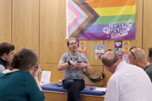 Image: Dr Mathew Wilkie of LGBT Youth Scotland leading one of the ‘meet the sector, meet the researcher’ stations